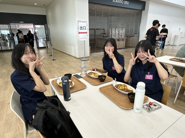 バスを降りて、初めて大学を見た生徒たちは口を開けてSORATIO SQUAREという帝京大学のシンボルタワーを見上げていました。