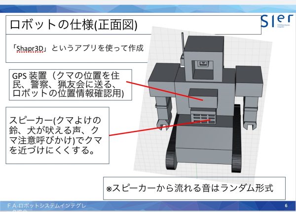 中島さんは、昨今のクマ被害を危惧し、「クマ対策ロボット」のアイデアを考え、3Dアプリでデザインし、ロボットの仕様や運用する際の価格帯等をスライドで堂々と発表しました。